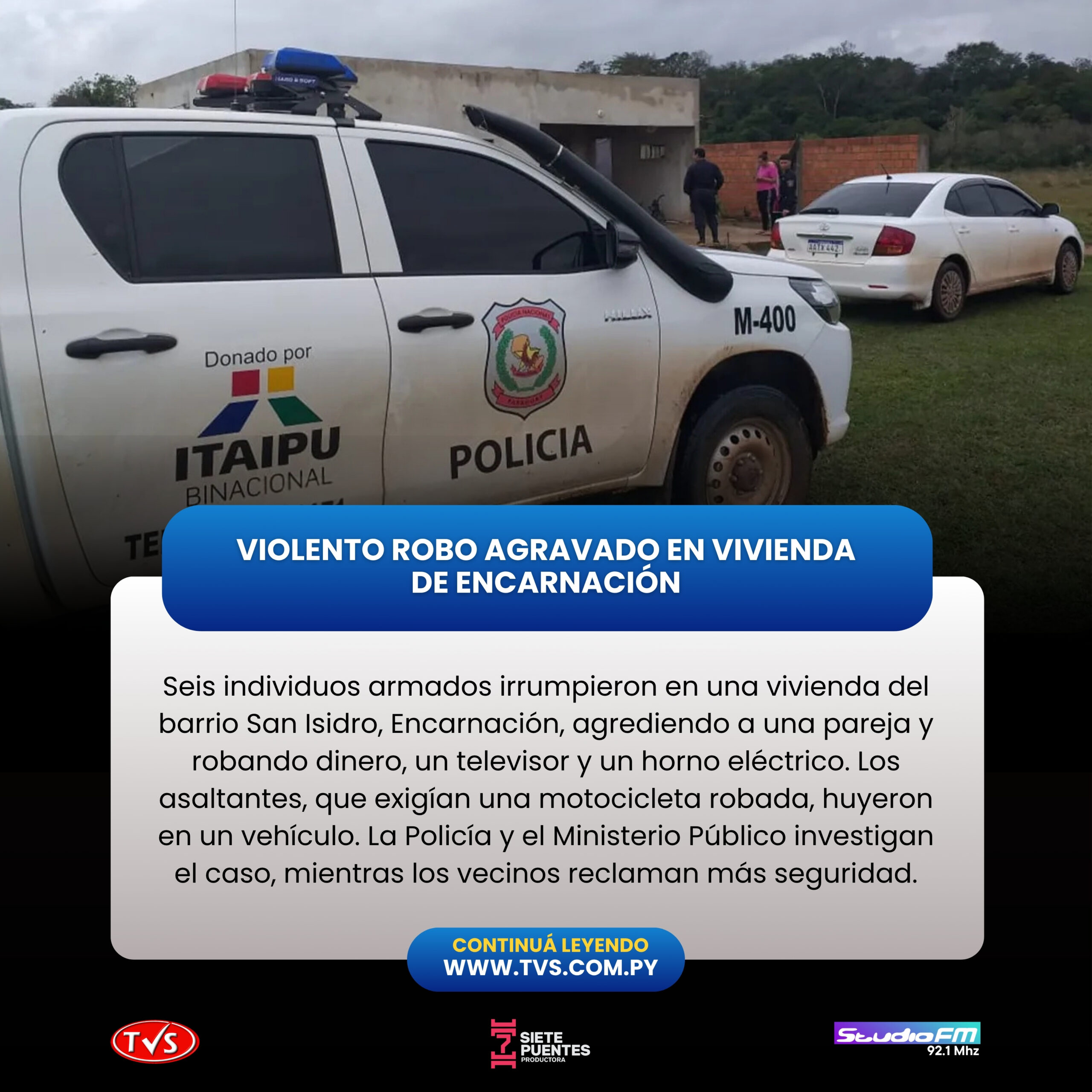 Una pareja sufrió un violento robo agravado perpetrado por al menos seis individuos armados que irrumpieron en su hogar, ubicado en la Fracción “La Rivera del Paraná”, en el barrio San Isidro de Encarnación.