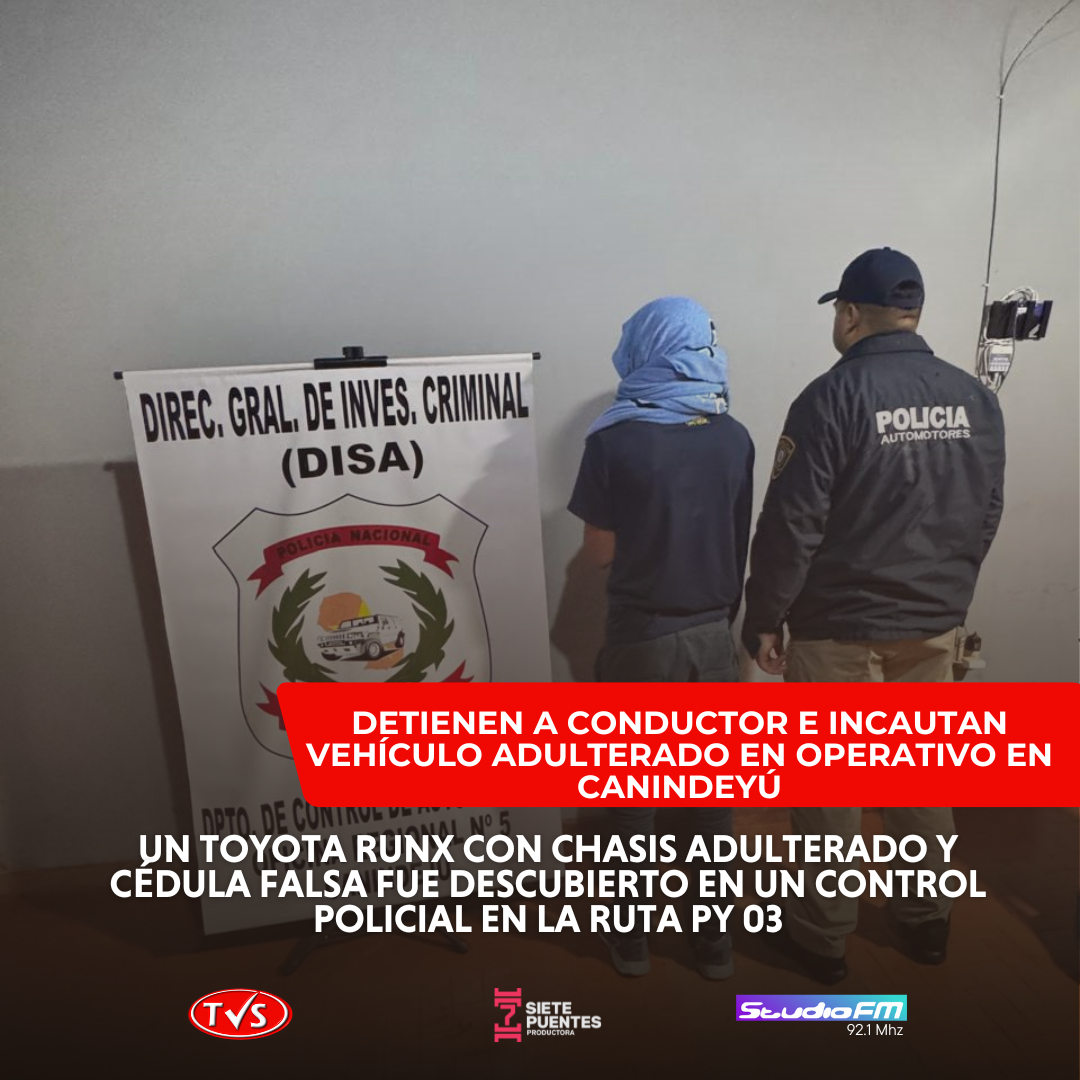 En un operativo de control vehicular realizado en la madrugada de este viernes, agentes del Departamento de Control de Automotores Regional Canindeyú, en conjunto con la Subcomisaría 15 de Yhovy, detuvieron a un conductor e incautaron un automóvil con evidentes signos de adulteración en la Ruta Nacional PY 03.