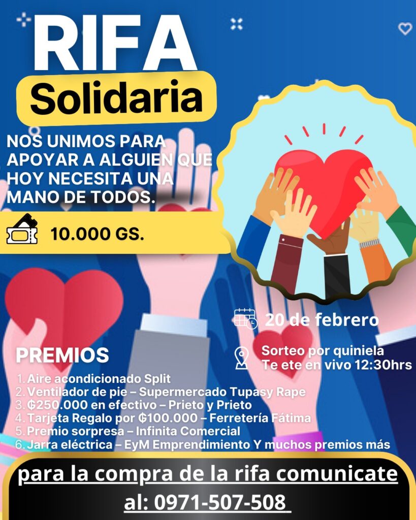 Con el objetivo de apoyar a Gabriela Vieira y su hija, un grupo de amigos y vecinos organizan una rifa solidaria. Cada número tiene un valor de 10.000 guaraníes, y el sorteo se realizará el 20 de febrero a las 12:30 del mediodía, siguiendo los resultados de la quiniela matutina. Además de la rifa, se están realizando adhesiones de pizza para recaudar fondos que permitan reparar el departamento y ayudar a cubrir las necesidades inmediatas de la familia.