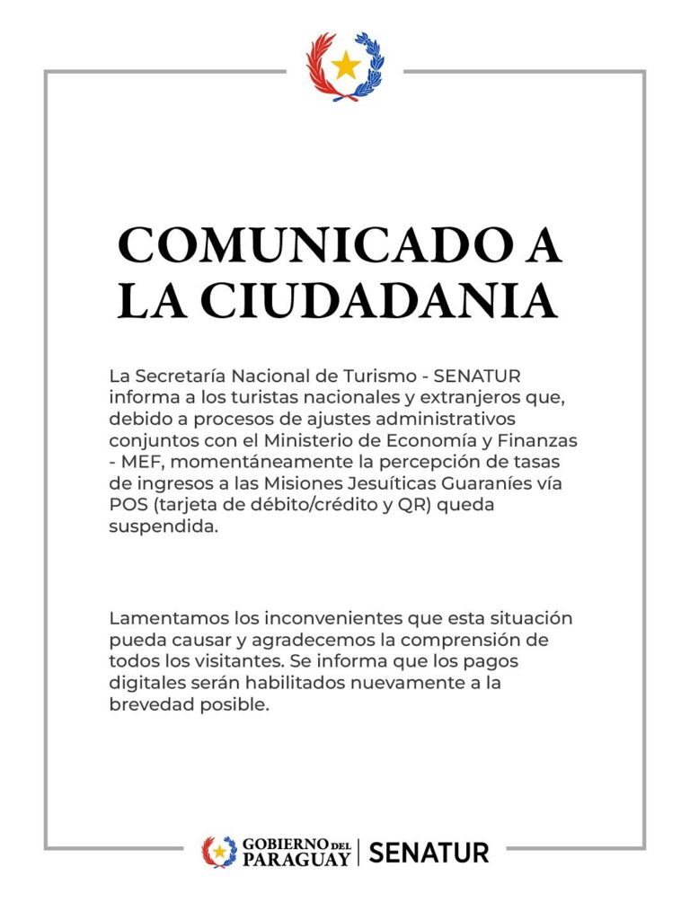 La Secretaría Nacional de Turismo (SENATUR) informó que, debido a ajustes administrativos coordinados con el Ministerio de Economía y Finanzas, los pagos digitales mediante POS y QR para el ingreso a las Misiones Jesuíticas Guaraníes se encuentran temporalmente suspendidos.