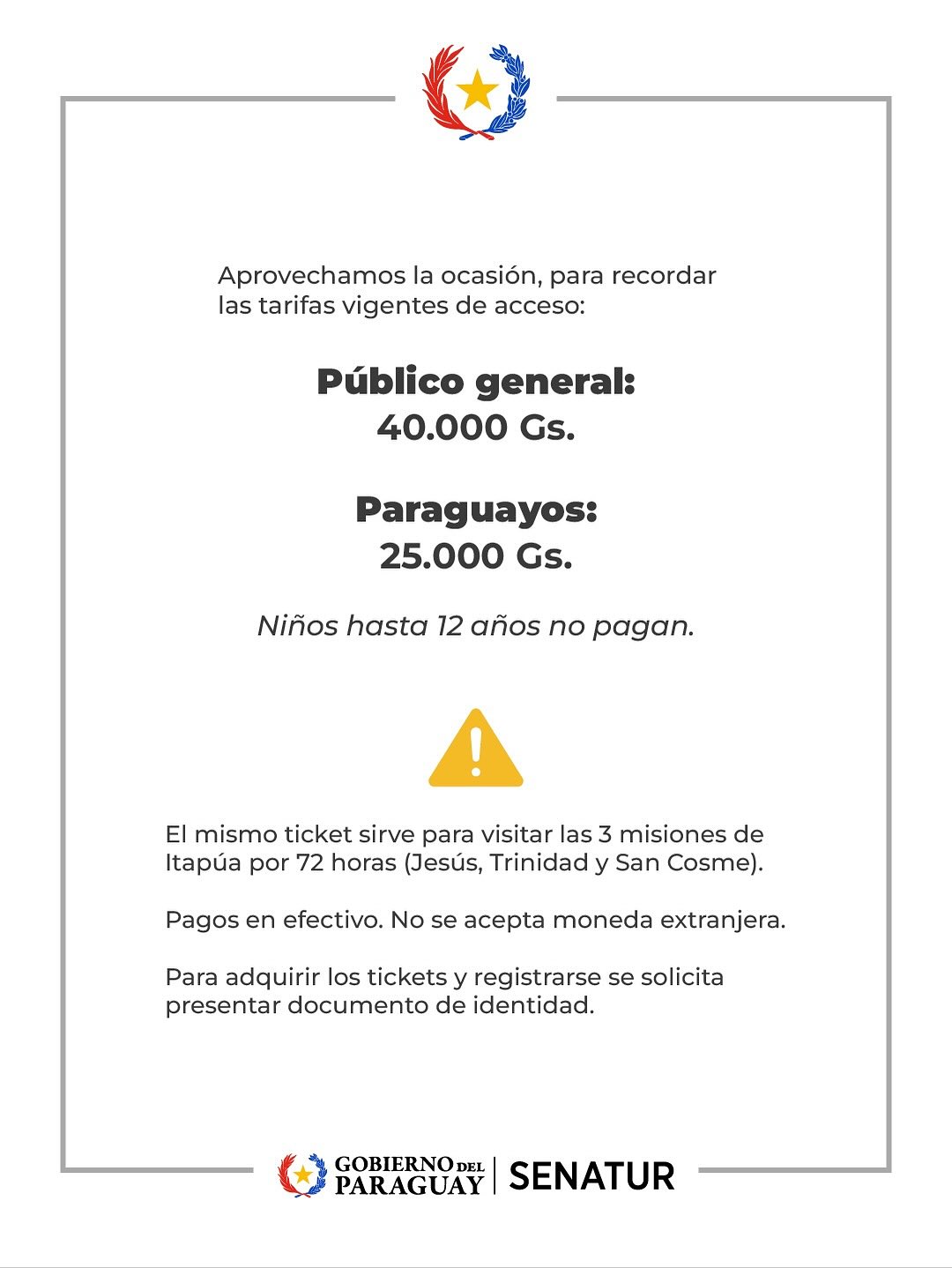 Con un solo ticket, los visitantes pueden recorrer las tres Misiones de Itapúa —Jesús, Trinidad y San Cosme— durante un período de 72 horas. Los pagos se realizan únicamente en moneda local y es necesario presentar un documento de identidad para la compra de los tickets.