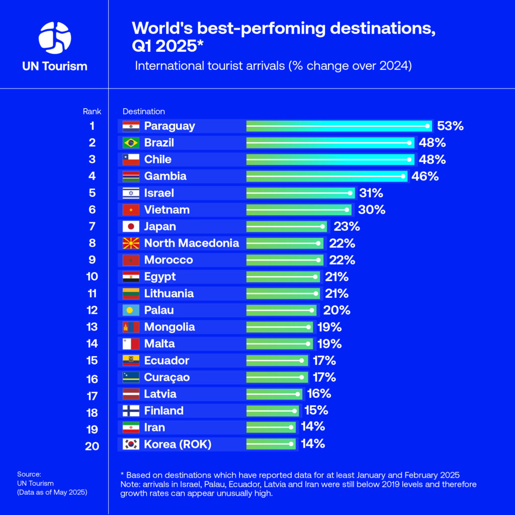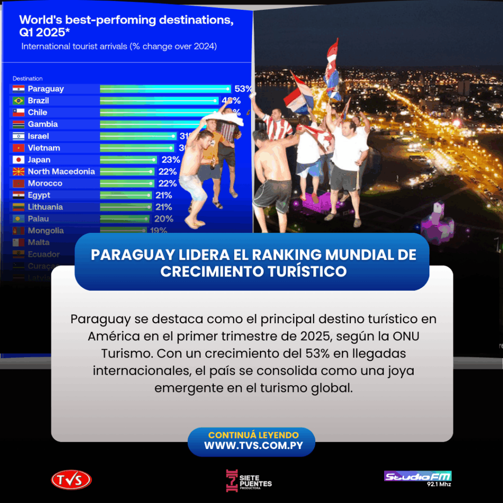 Paraguay se posiciona como el líder indiscutible en el ranking de destinos turísticos con mejor desempeño en América durante el primer trimestre de 2025, según el reciente informe de la Organización Mundial de Turismo (ONU Turismo). Con un impresionante crecimiento del 53% en llegadas internacionales, el país se consolida como una joya emergente en el panorama turístico global.