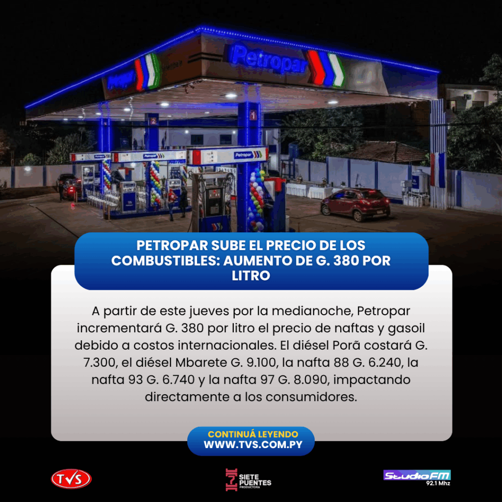 Petróleos Paraguayos (Petropar), la empresa estatal, comunicó que a partir de la medianoche de este Jueves se aplicará un incremento de G. 380 por litro en todos sus combustibles, abarcando tanto naftas como gasoil.