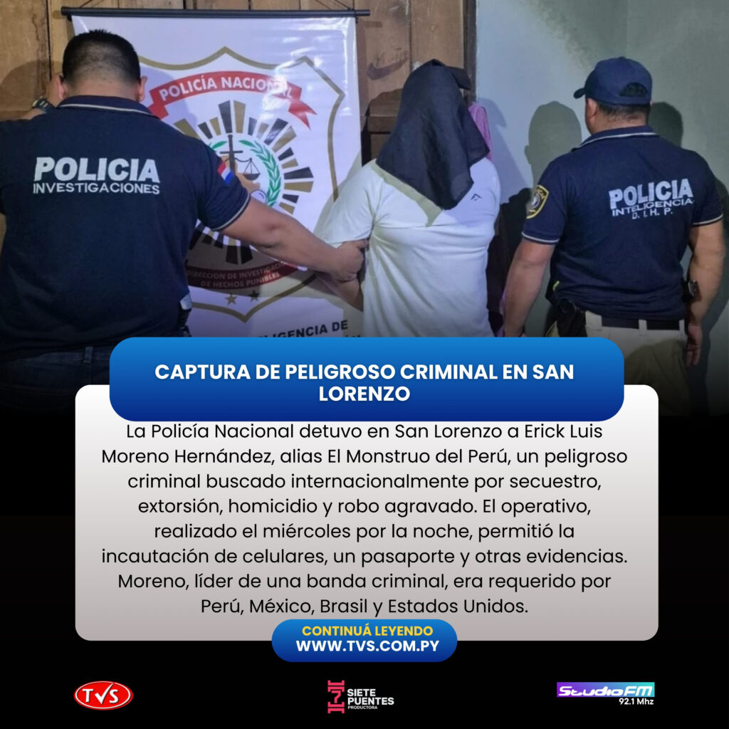 En un operativo conjunto, la Policía Nacional aprehendió a Erick Luis Moreno Hernández, alias El Monstruo del Perú, señalado como uno de los delincuentes más temidos de la región. La captura tuvo lugar en San Lorenzo, donde el sujeto era buscado por delitos graves como secuestro, extorsión, homicidio y robo agravado.