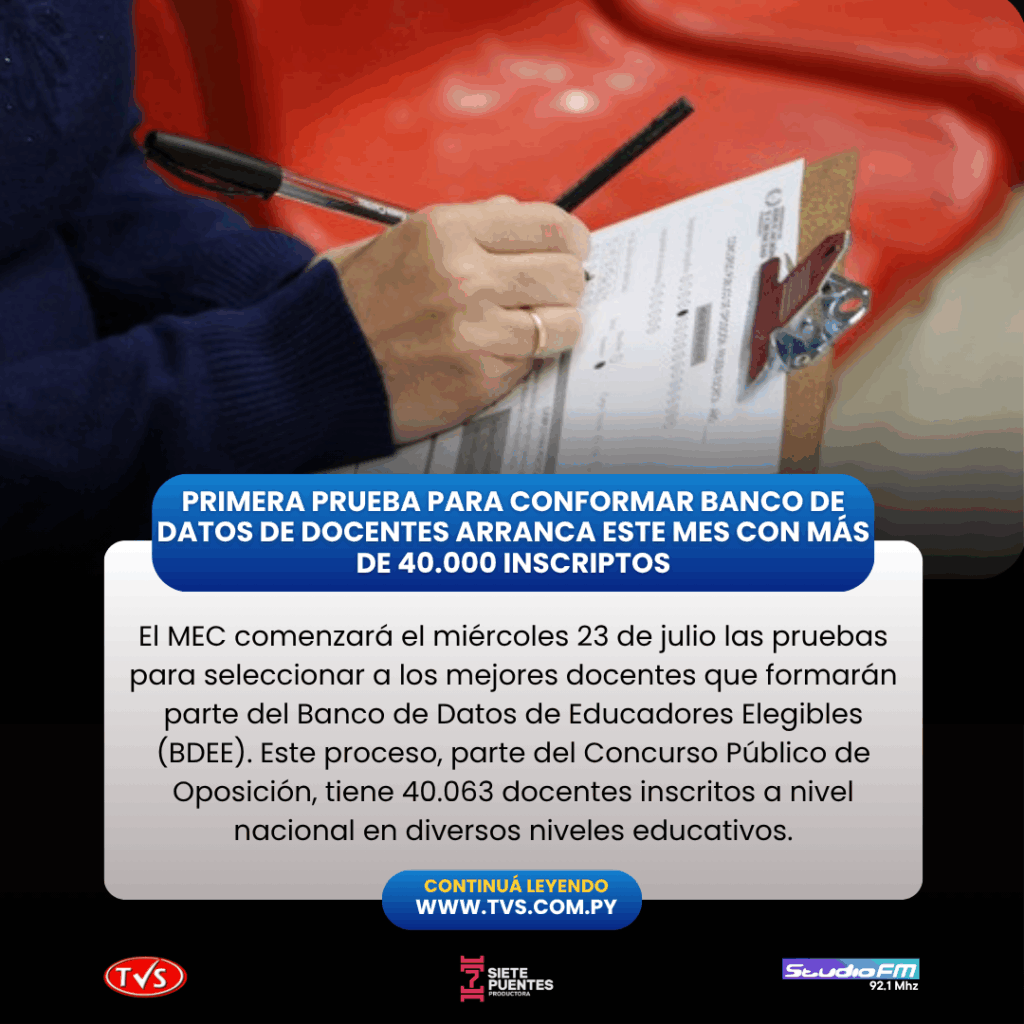 El Ministerio de Educación y Ciencias (MEC) de Paraguay dará inicio el próximo miércoles 23 de julio a las pruebas para seleccionar a los mejores docentes que integrarán el Banco de Datos de Educadores Elegibles (BDEE). Este proceso, enmarcado en el Concurso Público de Oposición, cuenta con 40.063 docentes inscriptos a nivel nacional para los niveles de Educación Inicial, 1° y 2° ciclos de la Educación Básica, 3° ciclo de la Educación Básica y Educación Media.