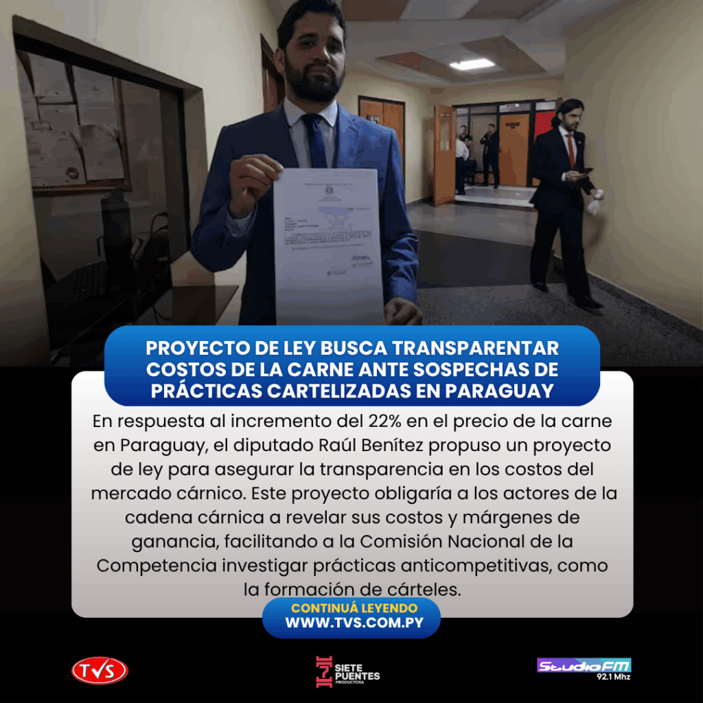 En un contexto de creciente preocupación por el aumento del precio de la carne en Paraguay, que según el Banco Central del Paraguay (BCP) ha incrementado un 22% en los últimos ocho meses, el diputado Raúl Benítez (Independiente) presentó un proyecto de ley titulado “que establece la transparencia de la estructura de costos del precio y del mercado de la carne comercializada al público”. Este proyecto tiene como objetivo principal obligar a los actores de la cadena cárnica a revelar información detallada sobre sus costos y márgenes de ganancia, permitiendo así que la Comisión Nacional de la Competencia (Conacom) investigue posibles prácticas anticompetitivas, como la formación de “cárteles” entre ganaderos, frigoríficos, distribuidores y minoristas.