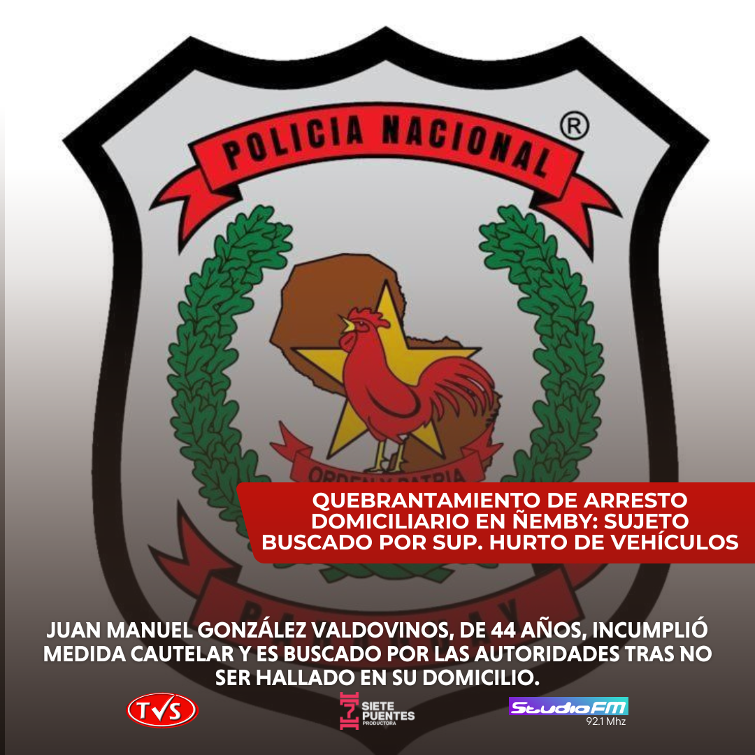 En un operativo realizado por el Departamento de Control de Automotores Regional Ytororó, se constató el quebrantamiento de medidas cautelares por parte de Juan Manuel González Valdovinos, de 44 años, quien debía cumplir arresto domiciliario en su vivienda ubicada en las calles Pratt Gill y Boquerón, barrio Pai Ñu, ciudad de Ñemby.