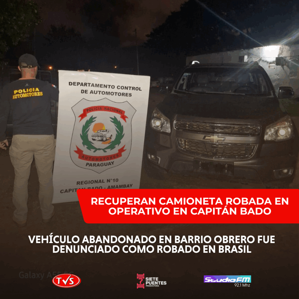Capitán Bado, 20 de junio de 2025 – En un operativo de patrullaje rutinario, personal del Departamento Control de Automotores Regional Capitán Bado, en conjunto con el equipo de Criminalística, logró la recuperación de una camioneta robada que se encontraba en situación de abandono en el Barrio Obrero, sobre una ruta terraplenada.