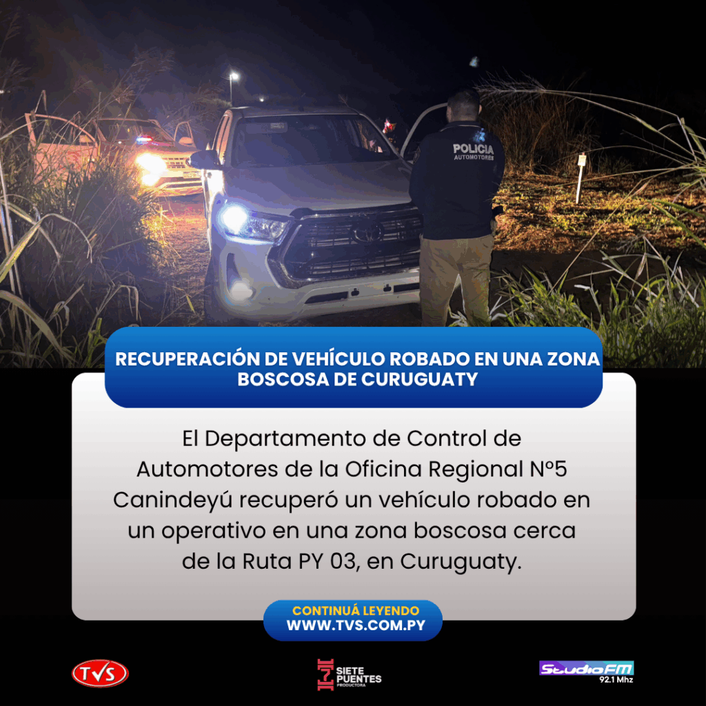 Curuguaty, 22 de julio de 2025 – El Departamento de Control de Automotores de la Oficina Regional N°5 Canindeyú informó la recuperación de un vehículo denunciado como robado, en un operativo llevado a cabo en una zona boscosa a aproximadamente 1.000 metros de la Ruta PY 03, en la ciudad de Curuguaty.