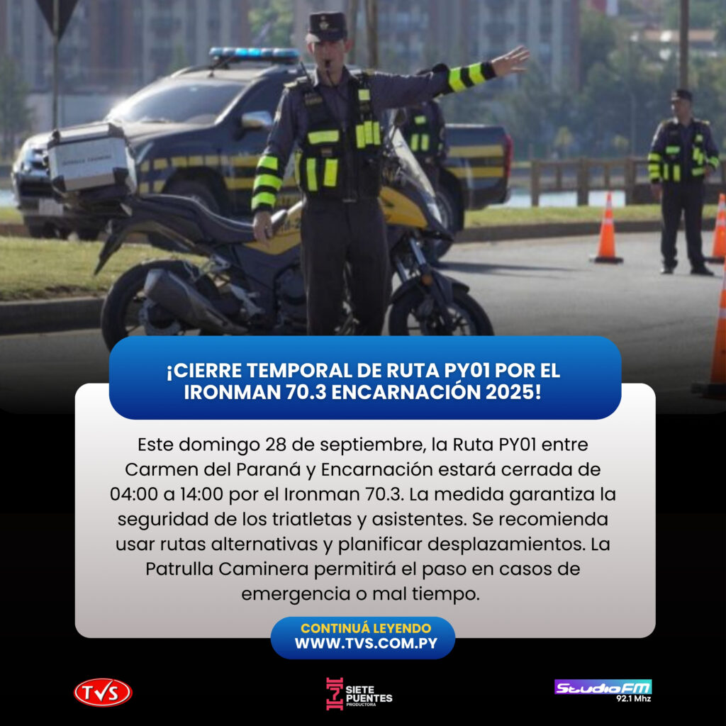 La competencia internacional Ironman 70.3 Encarnación 2025 se llevará a cabo este domingo 28 de septiembre, lo que implicará el cierre parcial de la Ruta Nacional PY01 entre Carmen del Paraná y Encarnación.
