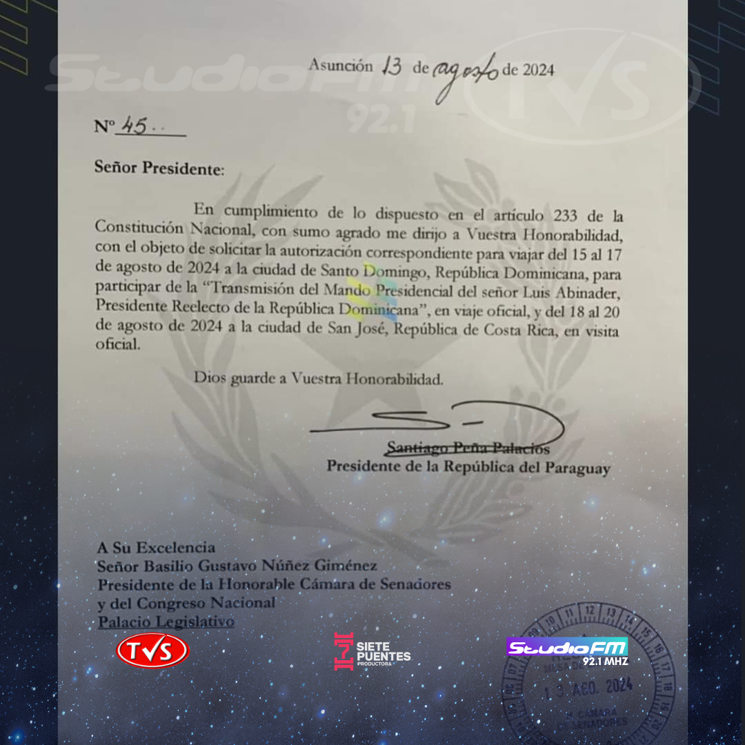 El presidente de la República, Santiago Peña, se prepara para dos importantes viajes internacionales justo al cumplirse un año de su mandato. Peña solicitó permiso al Congreso para ausentarse del país el día de su aniversario en el cargo, con destino a República Dominicana, donde participará en la Transmisión de Mando Presidencial de Luis Abinader.