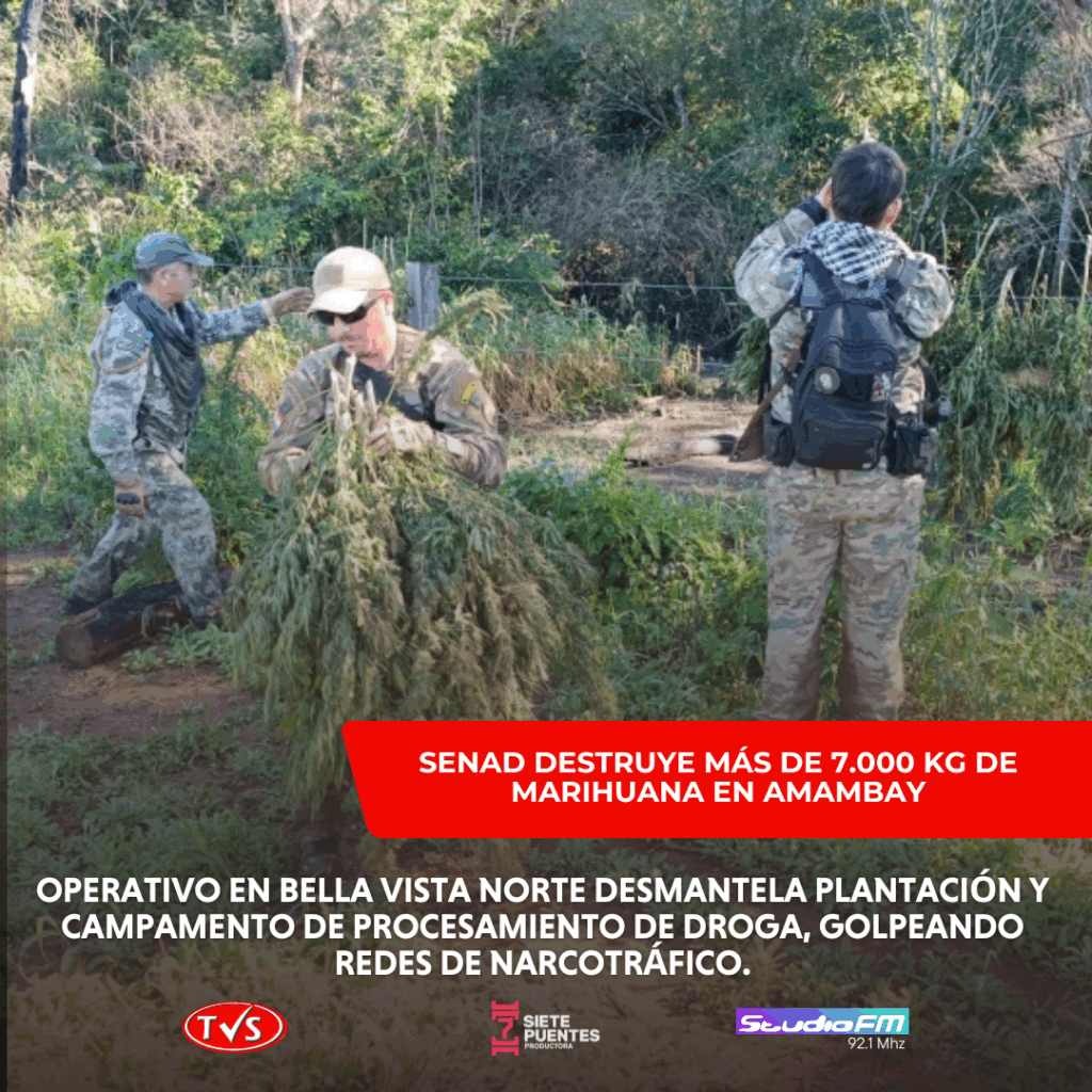 La Secretaría Nacional Antidrogas (Senad), a través de su Regional 10 en Bella Vista Norte, llevó a cabo un importante operativo este jueves en una zona rural del Departamento de Amambay, desmantelando una estructura dedicada al cultivo, procesamiento y acopio de marihuana. La acción, que contó con el acompañamiento del fiscal Celso Morales de la Unidad Especializada en la Lucha contra el Narcotráfico, se desarrolló en los límites de las estancias Agroganadera Tenonde Porã y Agroganadera La Tropa.