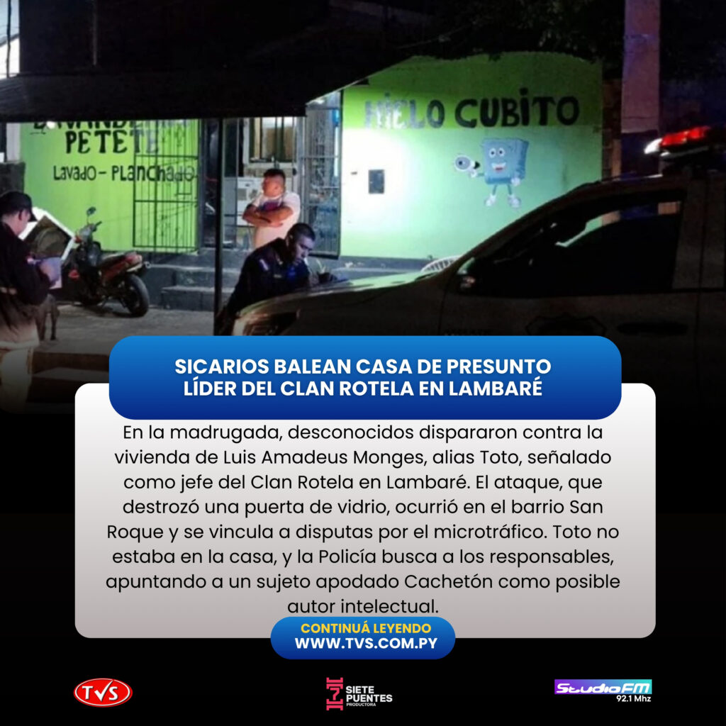 En la madrugada de este martes, desconocidos dispararon contra la vivienda de Luis Amadeus Monges Medina, alias Toto, señalado como líder del Clan Rotela en Lambaré. El ataque ocurrió alrededor de las 02:00 en la intersección de las calles De la Conquista y Santa Fe, en el barrio San Roque, generando temor entre los vecinos.