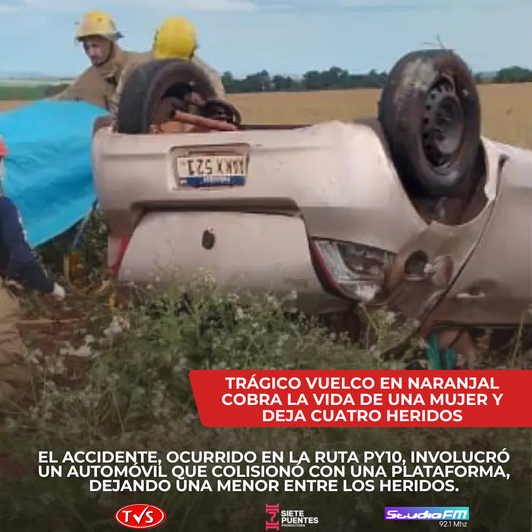 Un fatal accidente de tránsito ocurrió en la tarde del domingo 18 de mayo de 2025, alrededor de las 15:06, sobre la ruta PY10 en la ciudad de Naranjal, Alto Paraná, dejando como saldo una mujer fallecida y cuatro personas heridas, incluyendo una menor de edad.