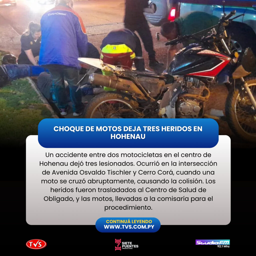 Un accidente entre dos motocicletas dejó tres personas lesionadas en la intersección de la Avenida Osvaldo Tischler y la calle Cerro Corá, en el centro de Hohenau, durante la noche del jueves.
