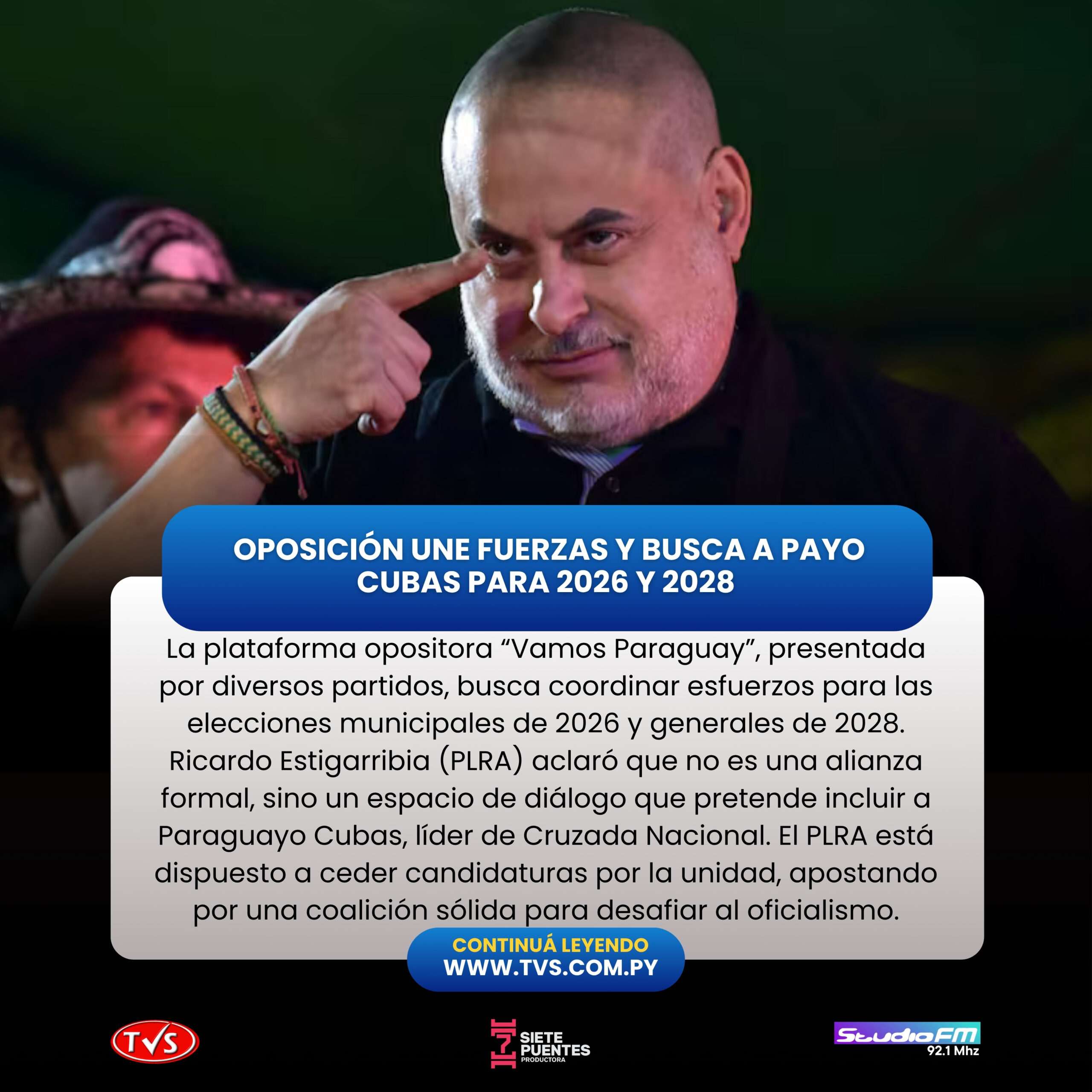 Diversos partidos de oposición lanzaron oficialmente “Vamos Paraguay”, una plataforma concebida como un espacio de coordinación y reflexión para los comicios de 2026 y 2028. En el evento participaron representantes de varios sectores del denominado tercer espacio, aunque destacó la ausencia de Paraguayo “Payo” Cubas, líder de Cruzada Nacional.