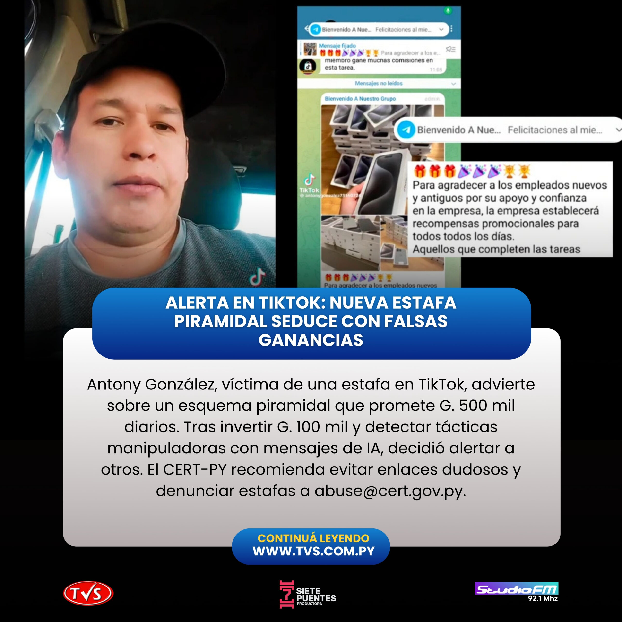 Antony González, usuario de TikTok, publicó un video narrando cómo fue engañado por una estafa piramidal que está ganando popularidad. Según explicó, todo comenzó con un anuncio que ofrecía ganar G. 500 mil diarios trabajando desde casa. El anuncio incluía un enlace que lo llevó a un grupo en Telegram.